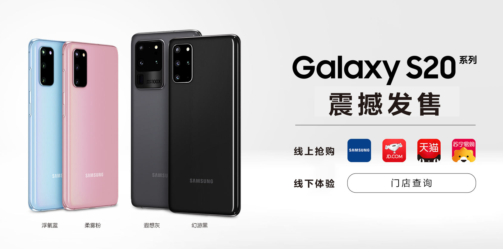 2月27日,三星正式在中国发布Galaxy S20系列旗舰手机。今日,新机正式迎来首销。其中,三星Galaxy S20 5G提供12GB+128GB版本,包括浮氧蓝,遐想灰,柔雾粉三种颜色可选,售价6999元;三星Galaxy S20+ 5G提供12GB+128GB版本,包括浮氧蓝,遐想灰,幻游黑三种颜色可选,售价7999元;