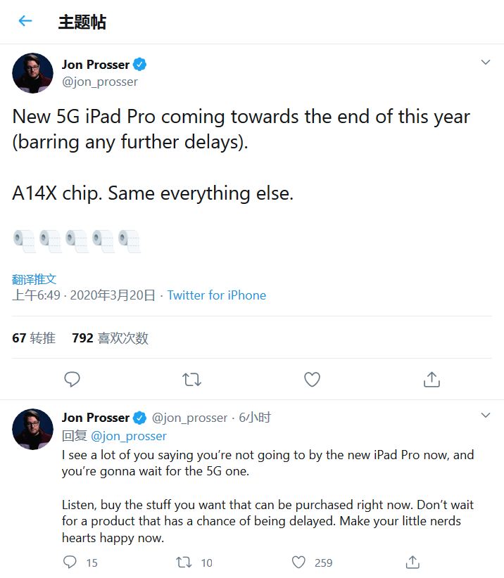 在推文中他用厕所卷纸代表信息的可靠性,而在推文中使用了五卷厕纸,这意味着准确性为100%。上周普罗瑟曾预测本周苹果将会推出新产品,果不其然苹果在昨日宣布了新款iPad Pro和MacBook Air,因此他的准确率应该是蛮高的,应该有比较可靠的信息来源。