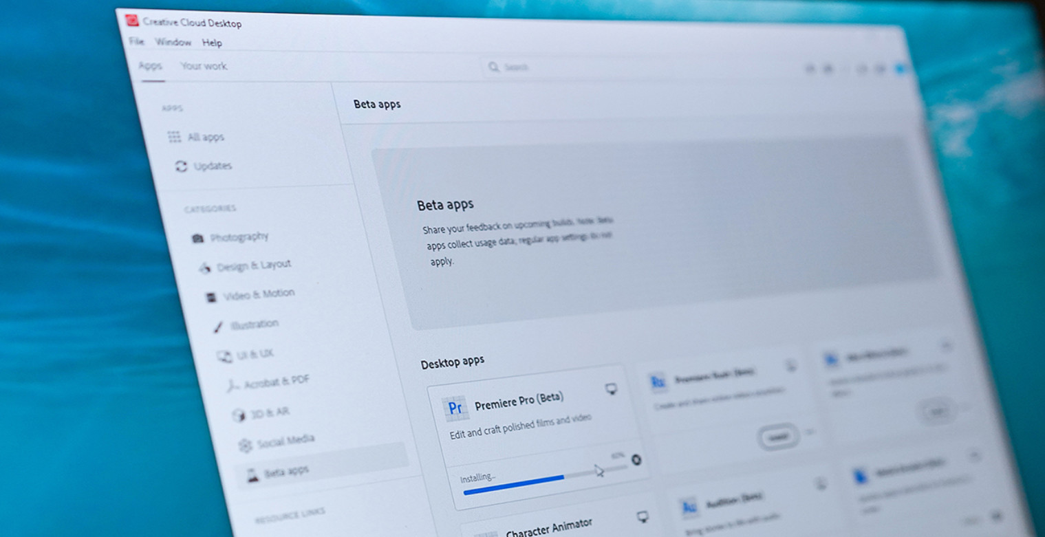 想要检查您是否能够使用,只需转到Creative Cloud Desktop客户端即可。如果有收到更新提示,会出现“Beta Apps”的标签,然后选择安装自己喜欢的Beta版本。