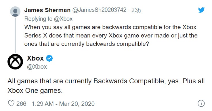 今日(3月20日),Xbox官方推特在回答网友的问题时表示:是的,现在这些游戏目前(Xbox Series X)都是可以向下兼容的。是的,包括所有的Xbox One游戏。