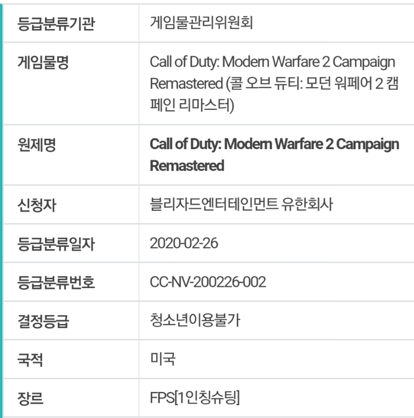《使命召唤6:现代战争2》高清复刻版基本上要确认了。日前韩国分级机构已经发布了对《使命召唤6:现代战争2复刻版》的评级。图片显示本作被评为“18”,动视于2月26日提交了评级申请。外媒表示,从目前掌握的消息看,复刻版只包含单人战役,没有加入多人模式的计划,有望在今年晚些时候发售。