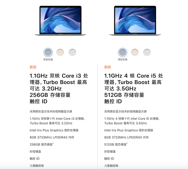 可以看到MacBook Air首次引入了4核处理器。这些处理器基于新的10纳⽶制程技术,中央处理器性能最⾼提升⾄2倍。