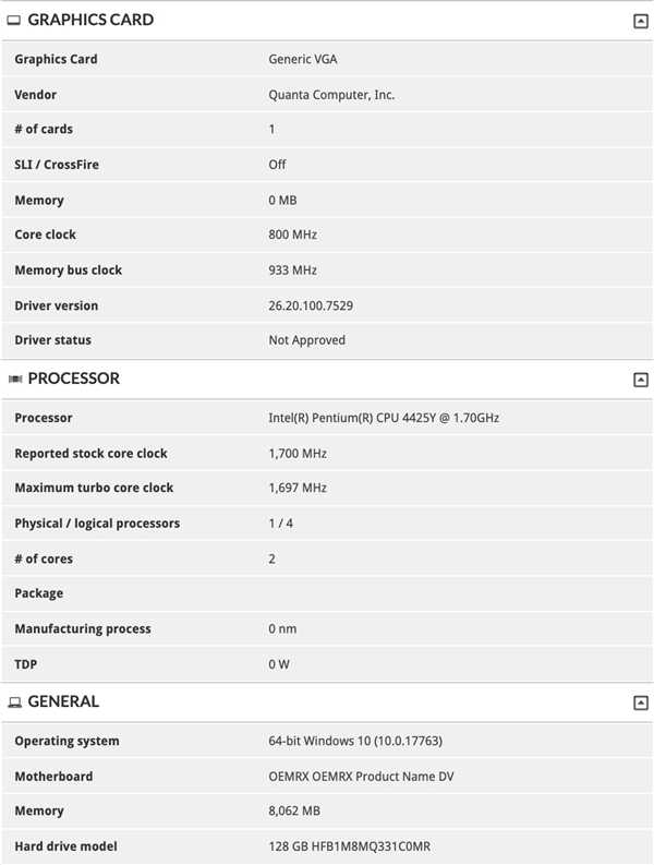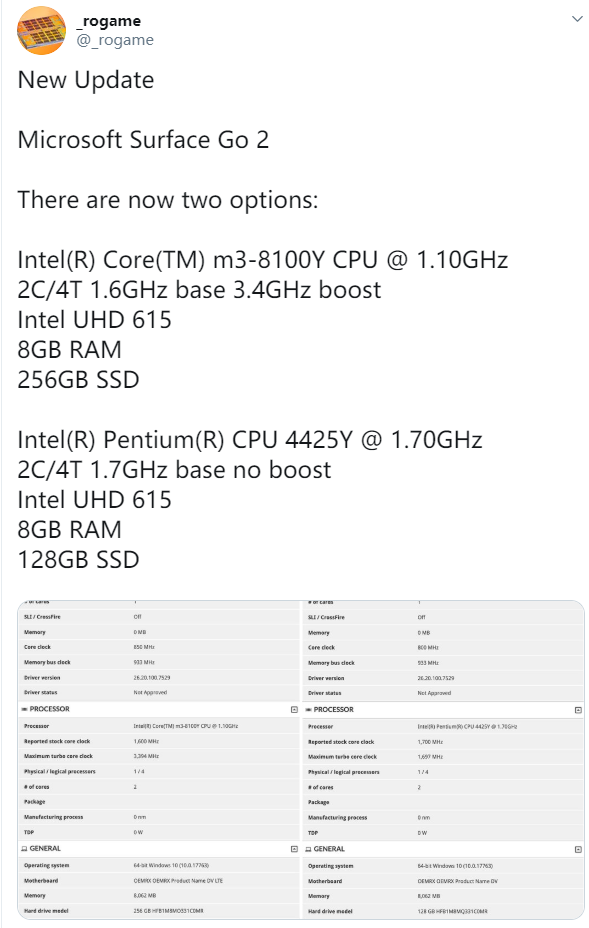 根据最新曝料,Surface Go 2将提供两种处理器可选,都属于Amber Lake八代酷睿家族的超低功耗版本,一个是奔腾金牌4425Y,除了频率提升到1.7GHz之外,其他和奔腾金牌4415Y并无二致。