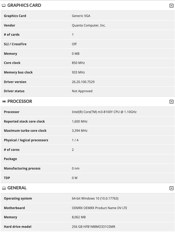 二是酷睿m3-8100Y,虽然还是14nm工艺的双核心四线程,不过支持睿频,基准为1.1GHz,最高可到3.4GHz,同时三级缓存增大到4MB,核芯显卡改名为UHD 615,热设计功耗反而降低到了5W,并支持动态调整,最高8W(1.6GHz)、最低4.5W(600MHz)。