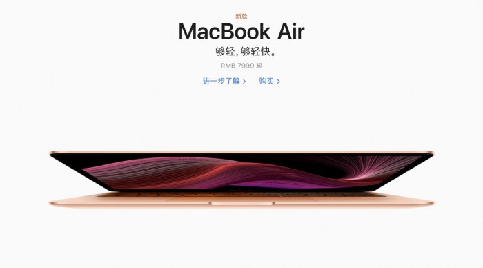 苹果昨天更新了 MacBook Air 产品线,新款 MacBook Air 搭载 Intel 最新第十代酷睿处理器,同时回归剪刀式键盘。处理器可以选择 1.1GHz 双核酷睿 i3,1.1GHz 四核酷睿 i5 以及 1.2GHz 四核酷睿 i7。