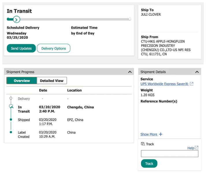 苹果尚未通过其自己的跟踪系统提供运输详细信息,但是正在通过UPS接收包裹的美国客户可以使用带有电话号码或订单号的按引用跟踪功能来跟踪其包裹。