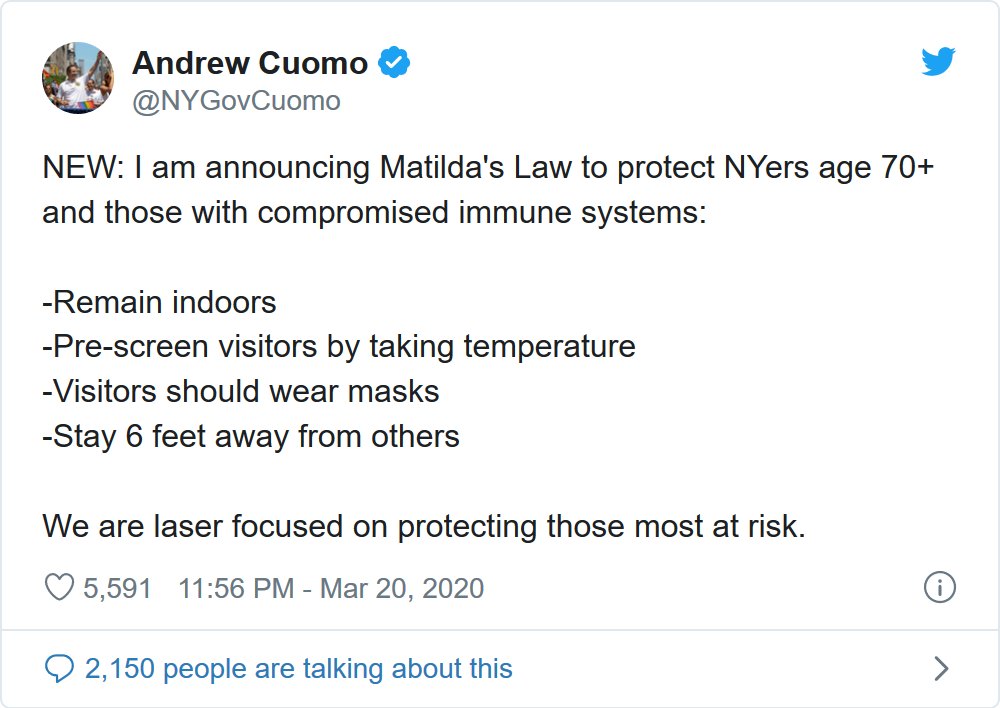科莫称,纽约州已经出现7100多例冠状新冠病毒病例,纽约市有4400多例。该州长表示,这一命令并不是什么留家避难的命令,他这是在通过Matlida's Law法来命令70岁以上的人或免疫系统存在问题的去替你留在家里、跟他人保持6英尺距离并在测量某位访客体温之前对其进行预检。