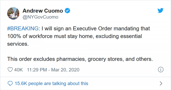 据外媒报道,纽约州州长安德鲁·科莫于当地时间周五宣布,他将签署一项行政命令,该命令将要求除基本服务外所有工作人员都必须待在家里,以此来防止新冠病毒在纽约州的蔓延。该命令将于周五签署并将于周日晚上生效。