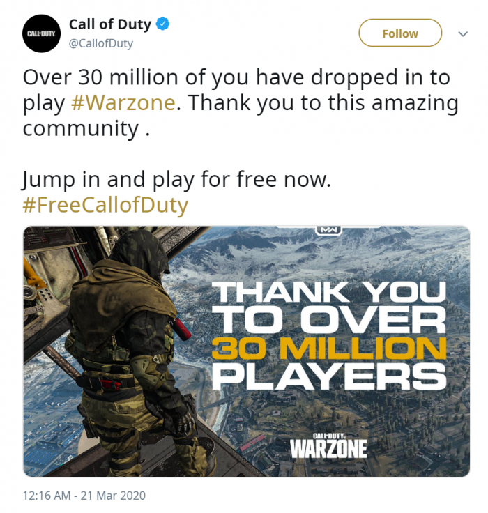 不得不说,疫情推动了一些游戏的发展,比如3月11日晚间上线的《使命召唤:战区》,其目前的成就已经是史上玩家人数增长最快的免费游戏。按照官方公布的细节,《使命召唤:战区》今天凌晨玩家数量已经突破3000万大关,而它也与首周达成2500万玩家的《Apex Legends》齐名(史上玩家人数增长最快的免费游戏)。