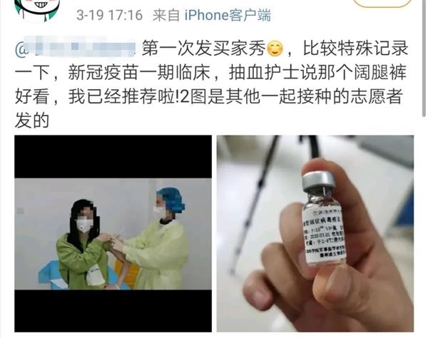 此前,这位姑娘在微博发了条买家秀,夸赞了店主的裤子,还顺便提了一句,她穿着那条裤子,作为志愿者,接种了新冠疫苗。