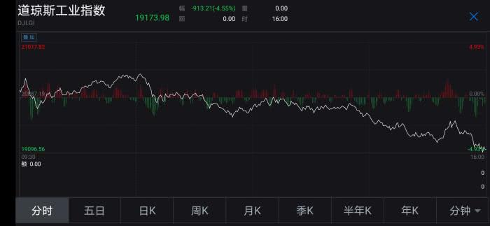 截至收盘,道指跌4.55%报19173.98点,失守20000点;标普500指数跌4.34%报2304.92点;纳指跌3.79%报6879.52点。另外,本周道指累计跌17.3%,纳指累计跌12.64%,标普500指数累计跌14.98%,三大股指均创2008年金融危机以来最大周跌幅。