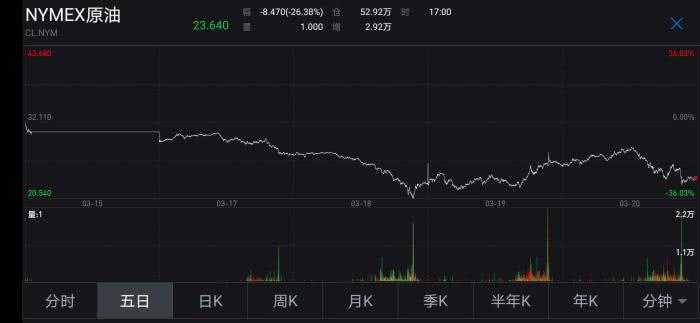 周五国际油价继续下跌,NYMEX原油期货收跌8.76%报23.64美元/桶,本周跌26.38%,创2008年以来的最大单周跌幅;布伦特原油期货收跌3.14%报29.35美元/桶,本周跌17.18%,连跌四周。