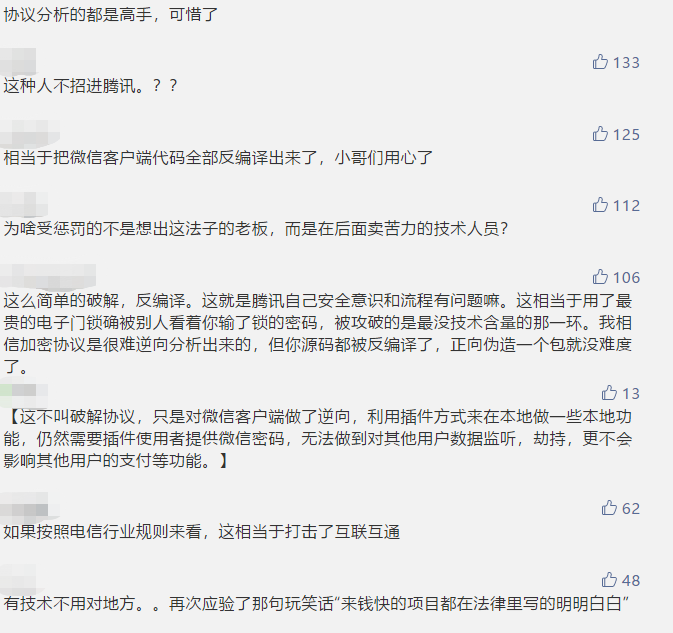 爱加密研究院院长程智力认为首先要认清这件事的本质,首先,它只能算是一个外挂,而这款软件只是在微信客户端做了逆向,无法做到对其他用户数据监听,劫持,更不会影响其他用户的支付等功能;其次,各个热门 APP 都有外挂,外挂门槛也不高,它只是帮助攻击者自己的帐号能够自动化做一些操作,而攻击者因为登录不了其他用户的微信,所以其他用户的帐号没安全问题,请放心。