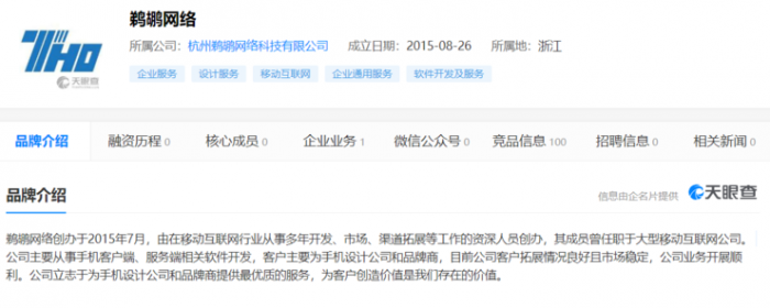 天眼查显示,鹈鹕网络科技有限公司创办于 2015 年 7 月,由在移动互联网行业从事多年开发、市场、渠道拓展等工作的资深人员创办,其成员曾任职于大型移动互联网公司。公司主要从事手机客户端、服务端相关软件开发,客户主要为手机设计公司和品牌商。