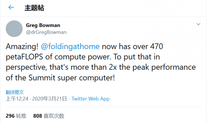 Greg Bowman博士表示,在启动参与COVID-19病毒研究之前Folding@home项目的志愿者数量大约是3万人左右,计算性能大约是100 petaFLOPS。而现在该项目志愿者数量超过了40万人,分布式计算能力超过470 petaFLOPS。