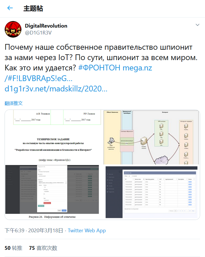 俄罗斯黑客组织“数字革命”(Digital Revolution)近日宣布,成功入侵了一家俄罗斯联邦安全局 (FSB) 的外包商,并发现了后者关于入侵物联网设备的项目计划。本周该组织公布了12份有关于“Fronton”项目的技术文档、图表和代码片段。本周早些时候ZDNet和BBC Russia获取并详细阅读了这些文档,并邀请安全专家对这些报告截图进行了分析,基本上确认FSB外包商建设Fronton项目的可行性。