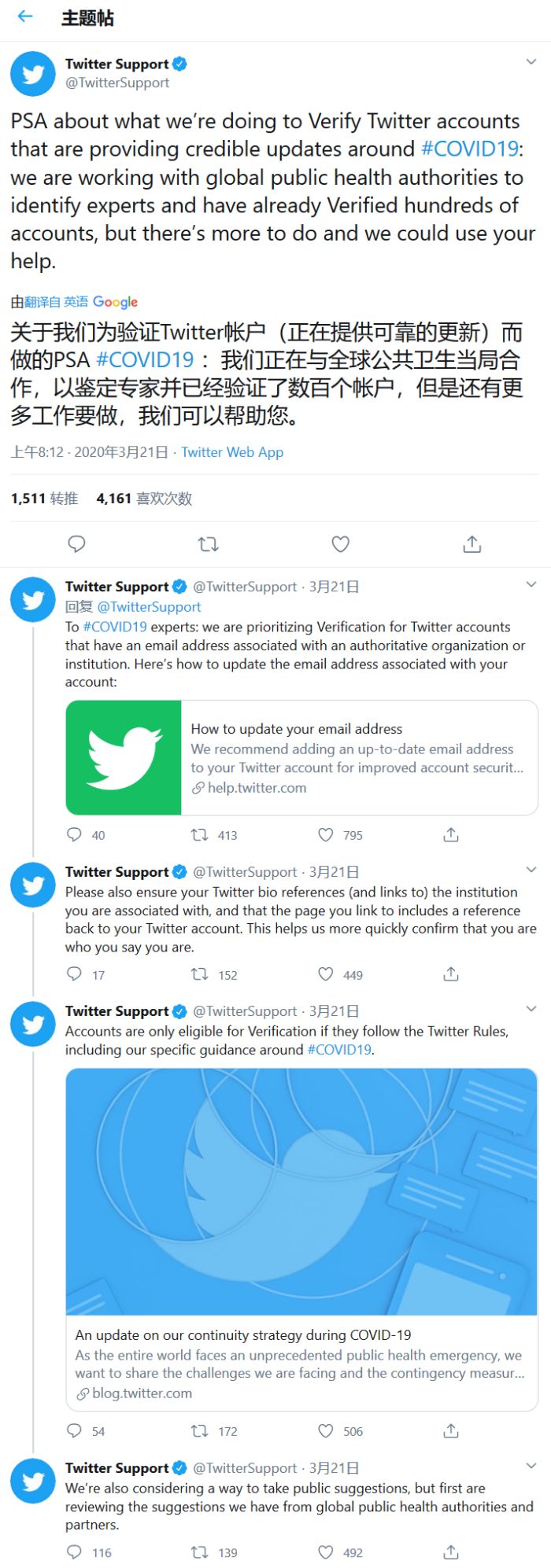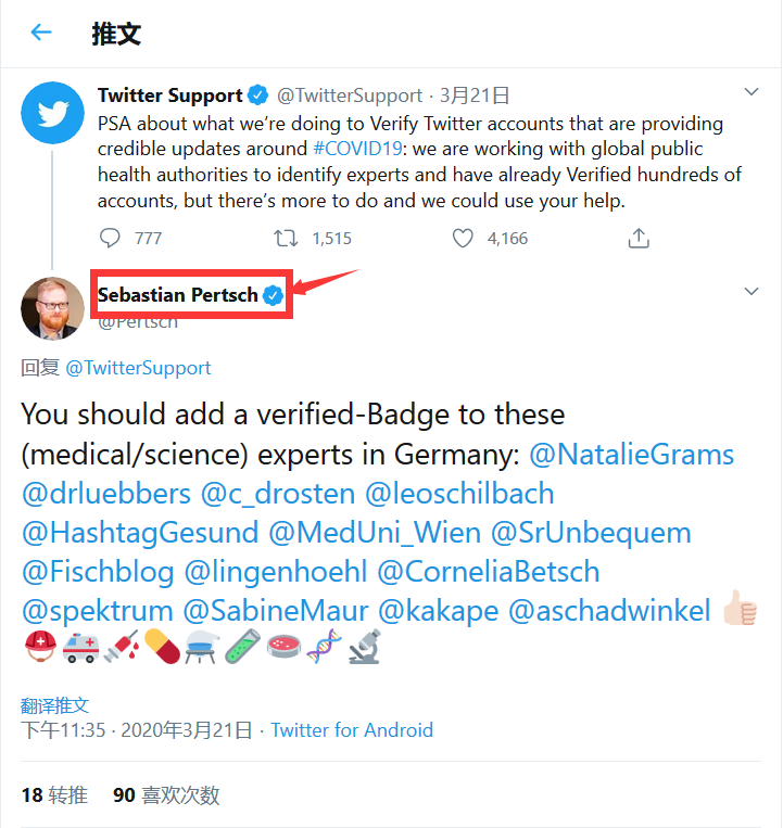 获得蓝色打钩徽章的用户被认证为是可靠、可信赖的信息发布者,主要是具备高知名度的记者、医疗领域专家、知名媒体以及各个组织的官方账号等等。推特表示目前正在和包括WHO、CDC、州卫生局、业内较高名气的学士机构合作,从而尽可能确保信息的可靠性,打击假新闻。