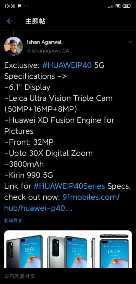 根据国外知名爆料人Ishan Agarwal最新发布的消息显示,全新的华为P40系列的顶配版并不是此前所称的P40 Pro Premium,而是将命名为P40 Pro Plus 5G或者P40 Pro+ 5G,而P40 Pro Premium仅仅是官方内部代号。从以往P系列的命名惯例来看,该命名也确实更为合理。