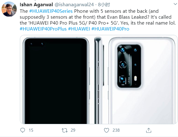 此外,Ishan Agarwal还表示,这款顶配版机型将配备前置三摄和后置五摄相机模组,这与此前曝光的消息基本一致,据悉,华为P40系列的三个版本将分别后置三摄、四摄和五摄相机模组,其中顶配版的P40 Pro Plus 将搭载5200万像素RYYB超感光主摄+4000万像素电影镜头组成的双主摄,并另外配备了一颗2000万双棱镜潜望式长焦镜头(支持高达10倍光学变焦),一颗800万常规长焦镜头以及一颗TOF镜头,称霸DxOMark几无悬念。