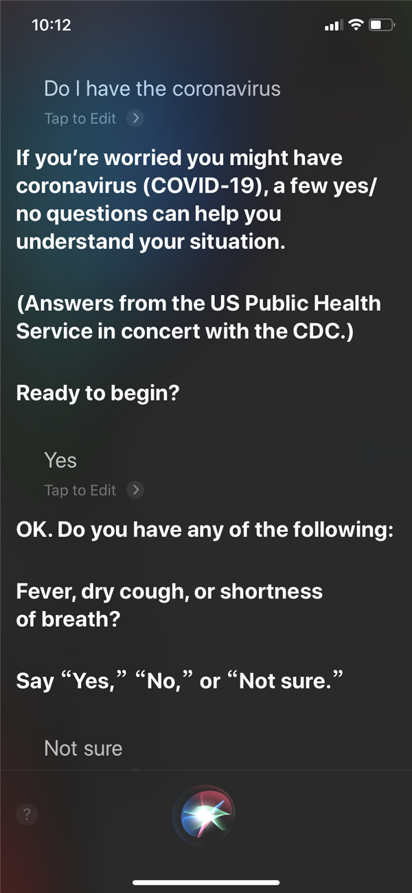 Siri会回答,如果你担心自己患有新冠病毒,这里有一些是或否的问题来帮你判断你的处境,这些问题和答案来自美国CDC。