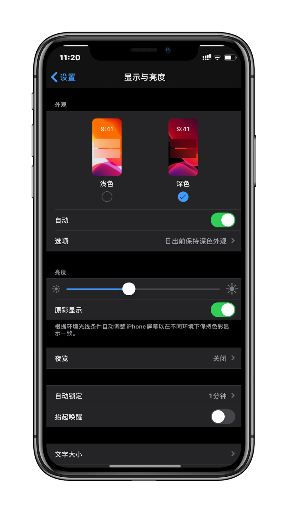2.进入“设置”-“显示与亮度”,点击“外观”中的“深色”,若点击“浅色”即为关闭深色模式。