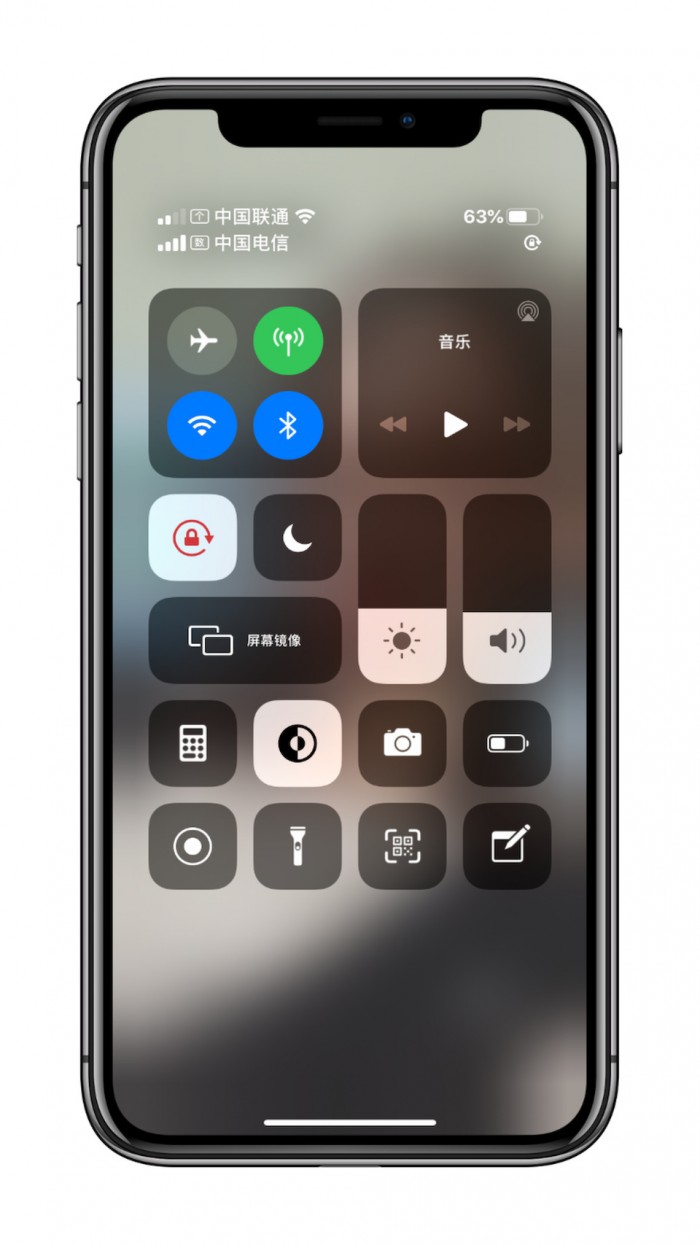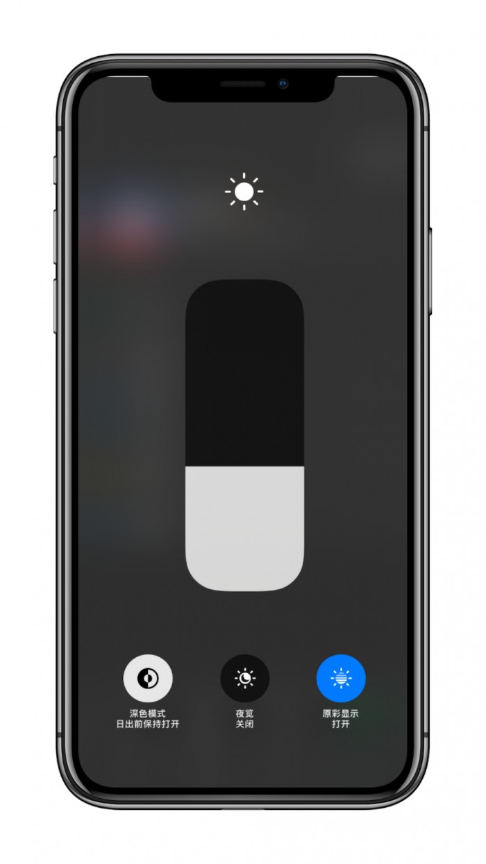 1.通过下拉中心的快捷菜单,找到位于屏幕右边的亮度条,长按呼出二级菜单,点击左下角的“深色模式”。