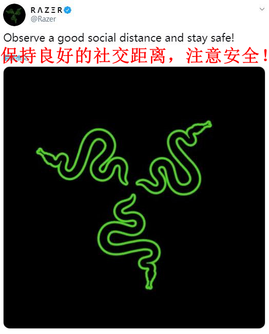 今日(3月22日),知名外设品牌雷蛇发布了一个非常特别的推特,展示了他们的“新LOGO”,将原本纠缠在一起的三条小蛇分开,以呼吁大家在疫情期间注意隔离。