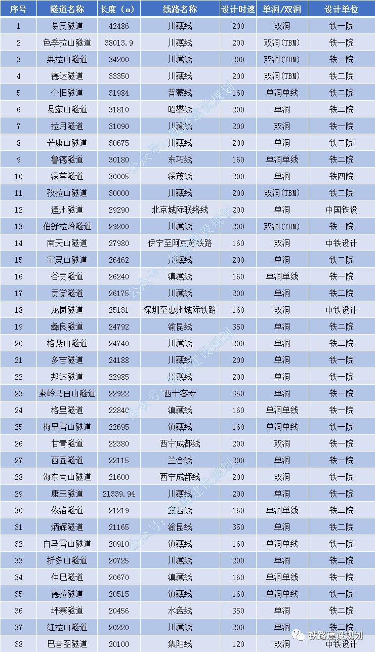 在这里边,史诗级难度的川藏铁路就拥有16座,最长的易贡隧道就在这条线上,全长达42486米,另外滇藏铁路6座、成西铁路2座、渝昆高铁2座,其他线路各1座。