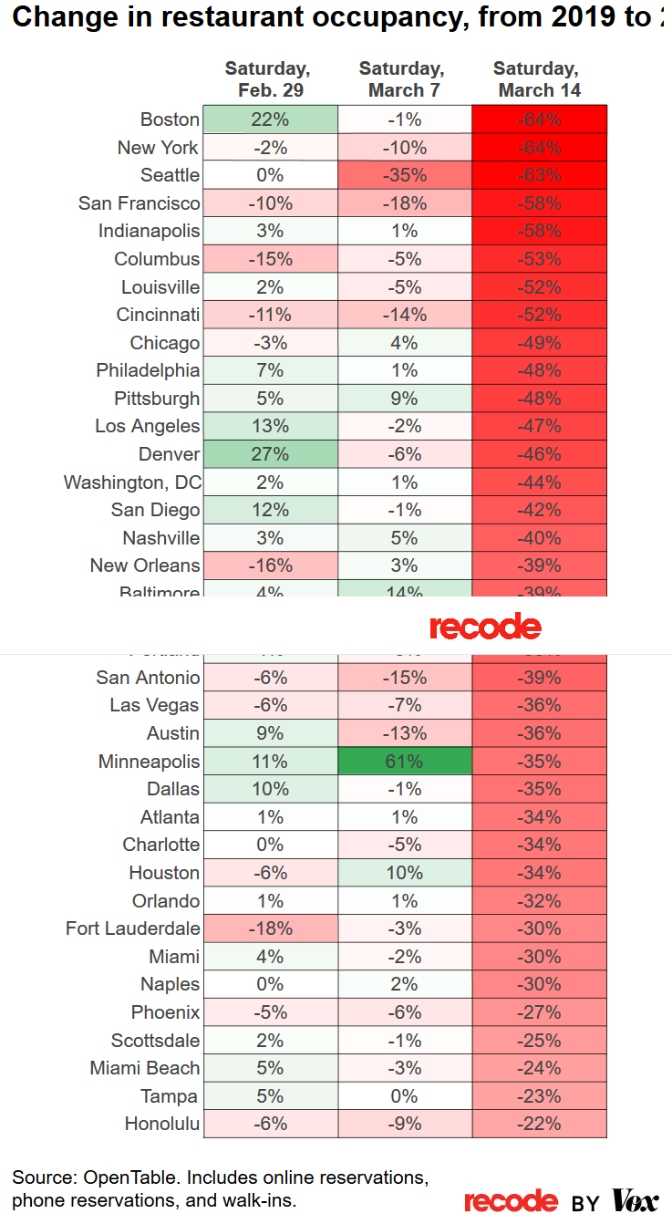 日本共同社3月22日消息,由于新冠疫情蔓延而采取的营业限制等,全球各地的餐饮店正在遭受毁灭性打击。美国餐饮店预约网站“OpenTable”的调查显示,作为对象的欧美等7国均客源大幅下跌,截至20日整体比上年减少98%。