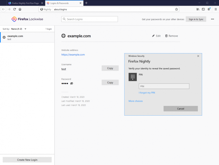 目前该功能已在 Firefox 76 Nightly 版本中可用。Firefox 会弹出一个要求输入 Windows 密码或 PIN 码的对话框,诸如显示密码、复制密码或编辑密码之类的请求都会产生提示。