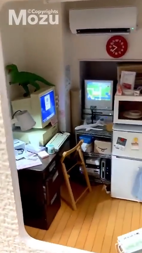 虽然空间足够小,但是这位小哥还是让不少物件都在这个基地中得到咱先,比如复古的CRT显示器,超迷你的电冰箱、微波炉等等,整体感觉非常的精致。