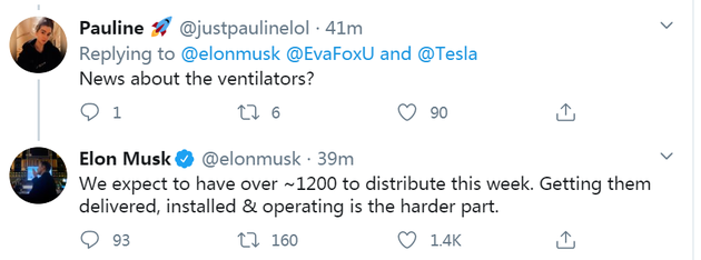 最新消息是特斯拉将在本周内完成大约1200台呼吸机的分发,这一消息亦是通过马斯克的Twitter发布,他在Twitter中表示,呼吸机的交付、安装和操作是其中最难的部分。