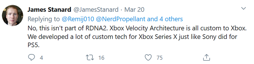 “不是的,这并不属于RDNA2。Xbox Velocity架构是为Xbox Series X全身定制的架构,我们为它开发了很多定制技术,就像索尼为PS5做的那样。”