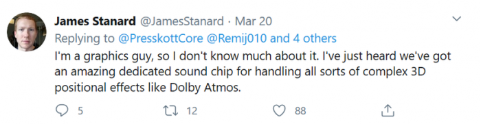 然而以上两个传言都是错误的。首先也是最重要的一个,微软的开发者James Stanard(图形优化和引擎架构职位)发推确认Xbox Series X和PS5一样也有一个专有的音频芯片,而那个“缺乏音频芯片将占用20% CPU”的传言也是错误的。