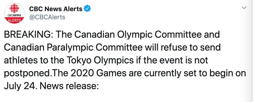 之前,加拿大奥委会和残奥委表示,如果东京奥运会不推迟举办,加拿大将拒绝派运动员参加。