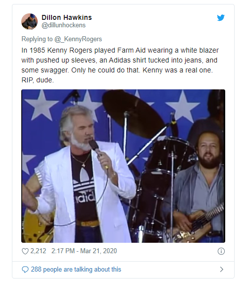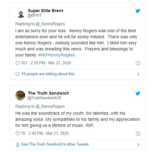 大量粉丝在社交媒体上悼念罗杰斯。一位推特用户写道:“肯尼·罗杰斯是有史以来最好的艺人之一,将无比怀念他。只有一个肯尼·罗杰斯-没有人的声音像他一样动听。