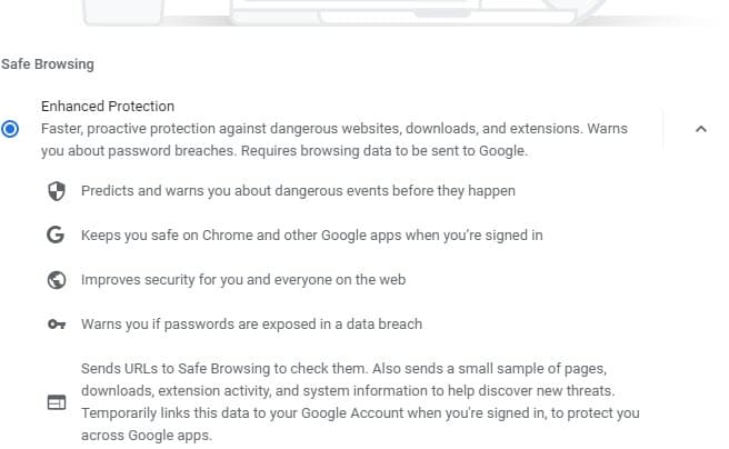 默认情况下,Chrome 已启用标准防护,但用户也可按需启用增强防护。启用后,谷歌奖项服务器发送数据,以检查数据泄露或有害的网站。