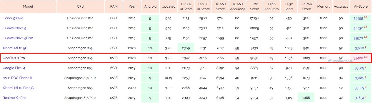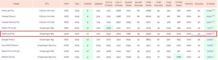 经查,一加8 Pro出现在苏黎世理工制作的AI Benchmark全球排行榜中,测试产品搭载骁龙865处理器,12GB RAM,综合成绩33480分,与小米10 5G相仿。不过,对比上一代骁龙855 Plus的一加7T,AI跑分成绩提升了25%。