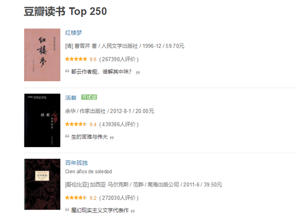最新TOP250中,《红楼梦》取代《追风筝的人》夺回榜首,TOP10包括:《红楼梦》《活着》《百年孤独》《1984》《飘》《三体全集》《三国演义》《白夜行》《福尔摩斯探案全集》《动物农场》。