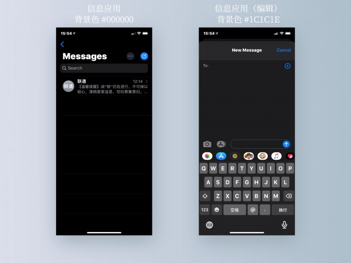 事实上,苹果系统界面也并非全部采用纯黑背景色,而是遵循了 iOS 13 设计文档中为深色模式背景色体系划分为的“Base”和“Elevated”层级关系。例如在信息 app 页面下,其背景色采用了纯黑的“Base”色组,而在用一页面下打开的短信编辑界面则采用了偏灰的“Elevated”色组来实现图层关系的区分。