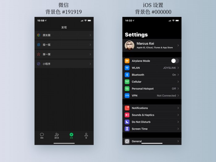 和深色模式下的苹果系统界面相比,开启深色模式后的微信采用了偏灰色而非纯黑作为背景,从设计规范来看的话两者难以评出个孰是孰非,毕竟在所有关于深色模式的设计规范中,到底采用何种颜色作为背景没有定论。