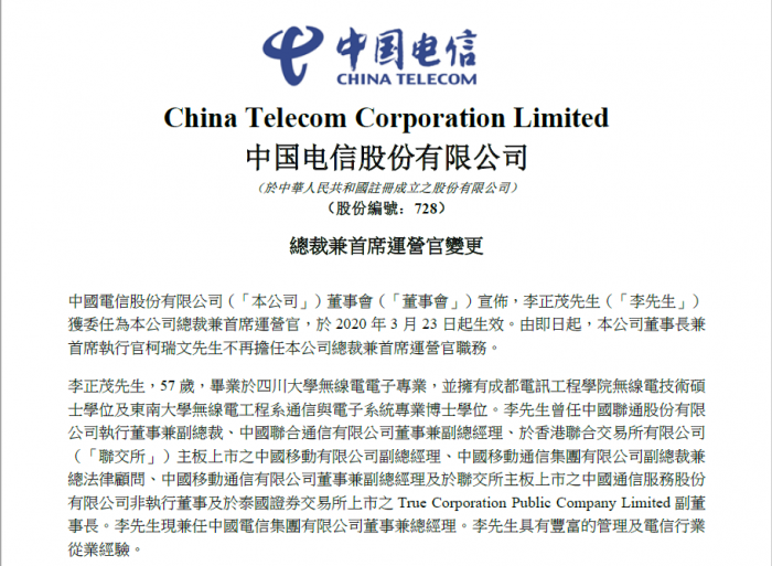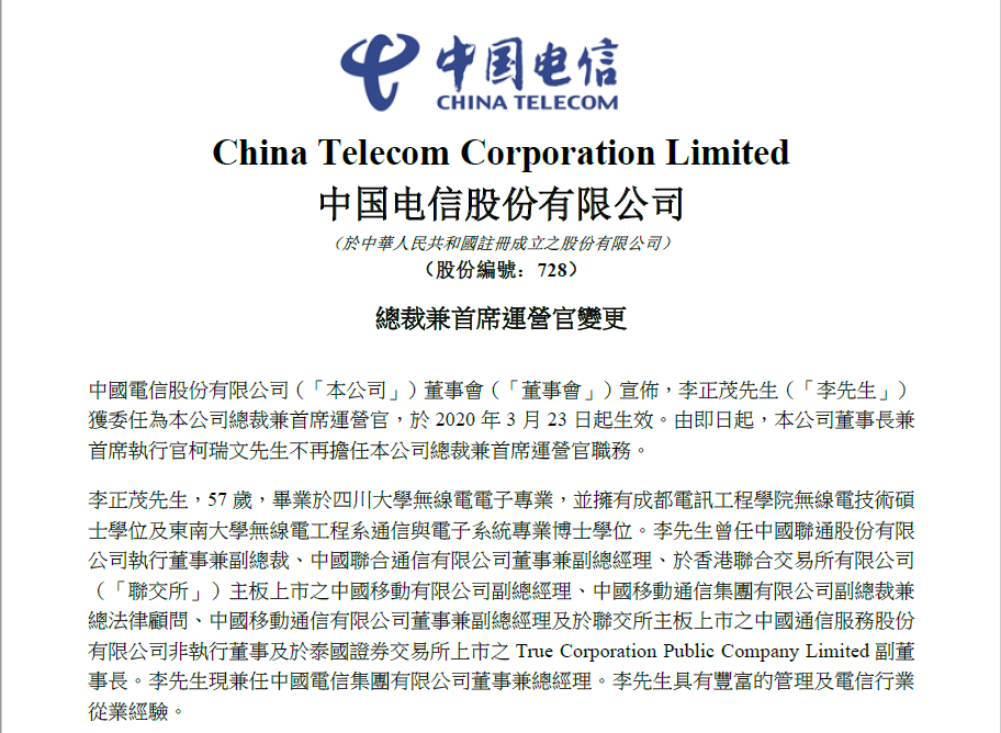 今日,中国电信股份有限公司在港交所发布公告,公告指出董事会宣布,李正茂先生获委任为中国电信股份有限公司总裁兼首席运营官,于2020年3月23日起生效。由即日起,中国电信股份有限公司董事长兼首席执行官柯瑞文先生不再担任中国电信股份有限公司总裁兼首席运营官职务。