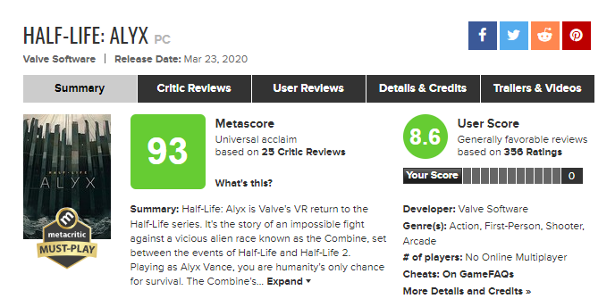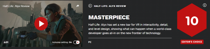 《半条命:Alyx》今日正式推出,媒体评分也同步解禁。外媒IGN给出了10分满分好评。Metacritic目前平均分为93分。