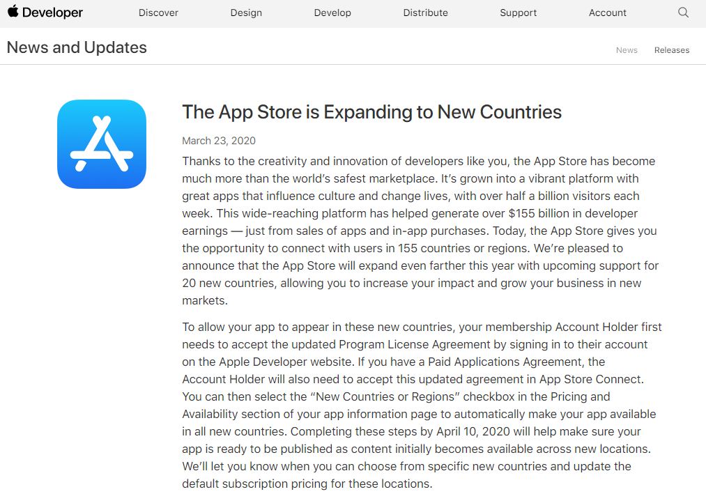 苹果公司建议开发人员在2020年4月10日之前完成这些步骤,以确保他们的应用程序能够按时顺利地向这些新国家/地区推出。