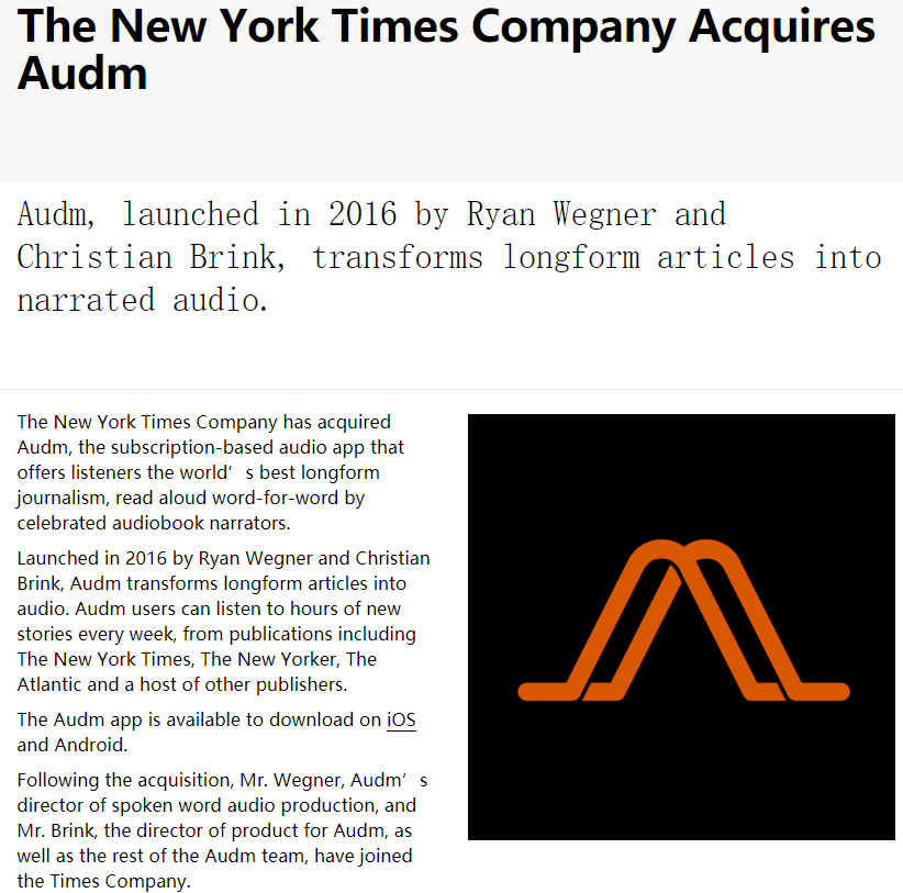 据外媒TechCrunch报道,纽约时报公司周一宣布已收购一家称为Audm的初创公司,该公司推出的App可将长篇新闻转化为音频。尽管还有其他将新闻文章转化为音频的服务,包括Instapaper和Pocket等后来使用的应用程序,但Audm还是通过使用专业配音演员来讲述内容而不是自动配音技术来体现与众不同。