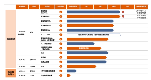 目前该公司已发现并研发了9种候选药物:1种(奥布替尼,即ICP-022)已向国家药品监督管理局(NMPA)提交新药申请并获得受理;2种(ICP-192和ICP-105)处于I/II期临床试验阶段;6种处于新药研究申请(IND)准备阶段。