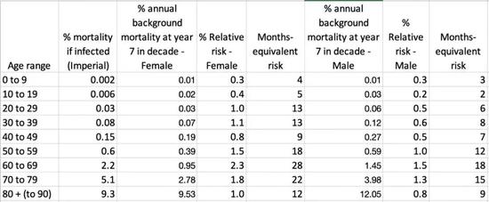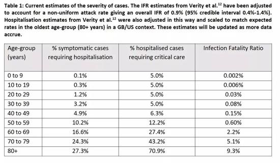 伦敦帝国学院研究人员的最新报告提供了对新冠病毒感染后死亡的特定年龄段风险的估计值,这些风险如下表所示。