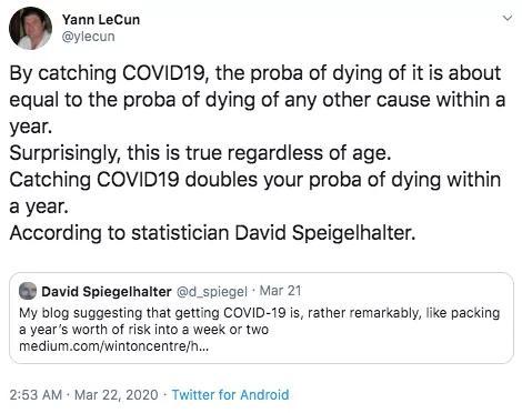 Yann LeCun转发:感染COVID-19会使你在一年内的死亡几率翻倍