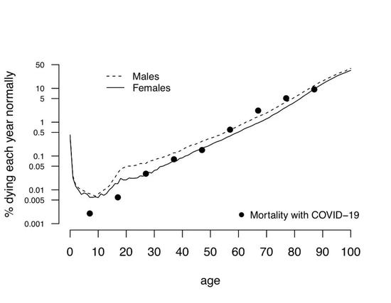 如果将感染COVID-19后的死亡率叠加在上面的“生命表”上(绘制每10年中的第7年),结果如下图,可以看出,感染COVID-19后的死亡风险与正常死亡风险的趋势是一致的。