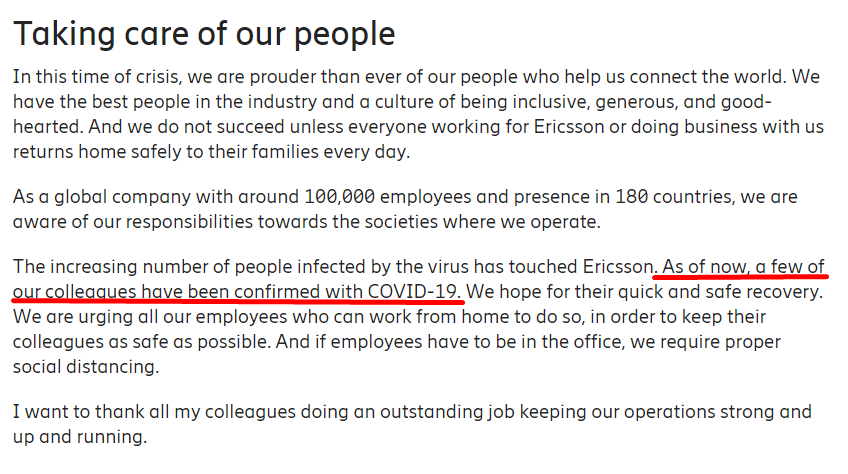 对于感染了新型冠状病毒的员工,Borje Ekholm写道:“希望他们能够很快安全康复。我们敦促所有可以在家办公的员工都在家中远程办公,从而确保同事们尽可能安全。如果一些员工必须在办公室办公,我们要求他们必须保持适当的社交距离。”
